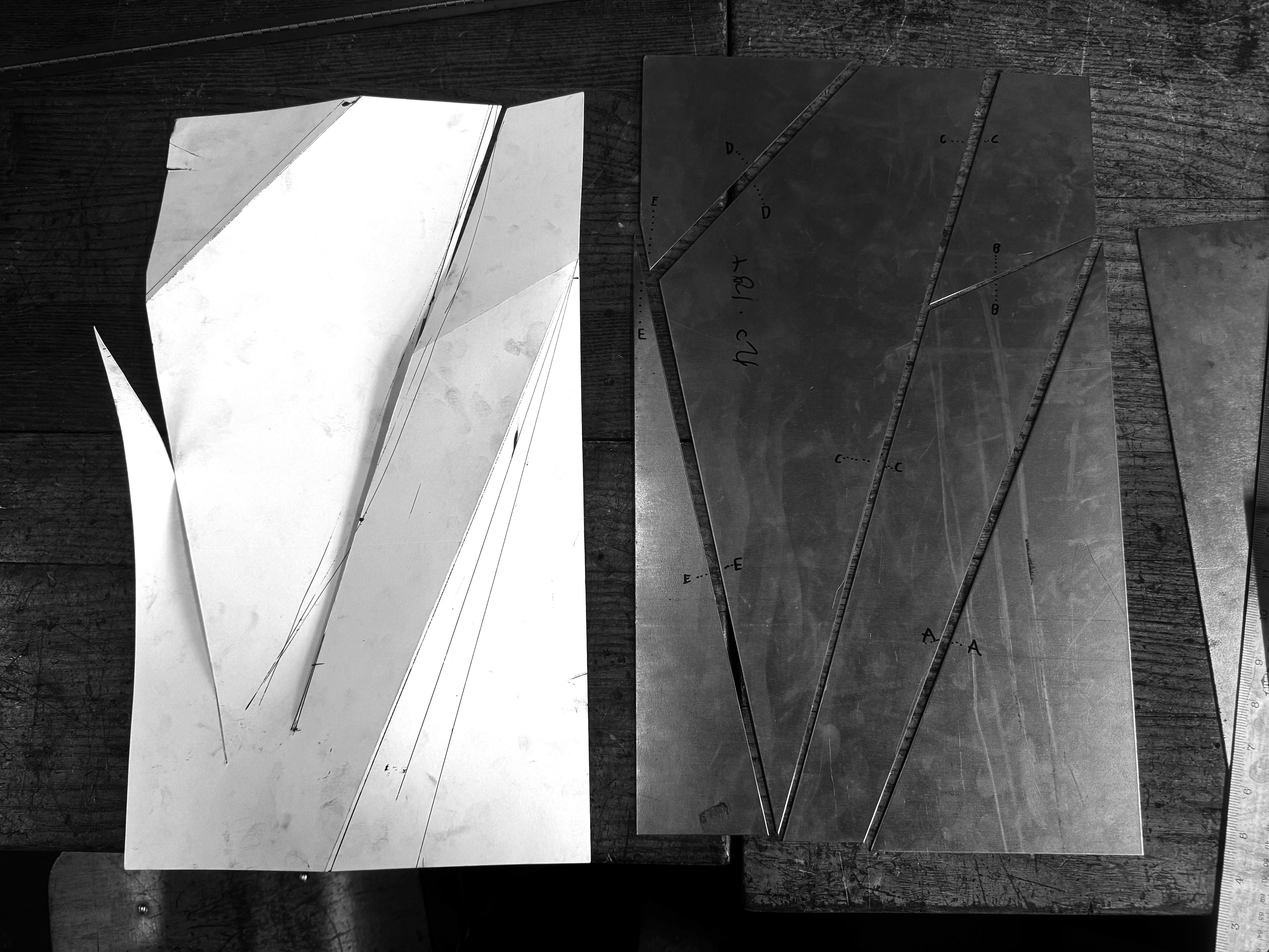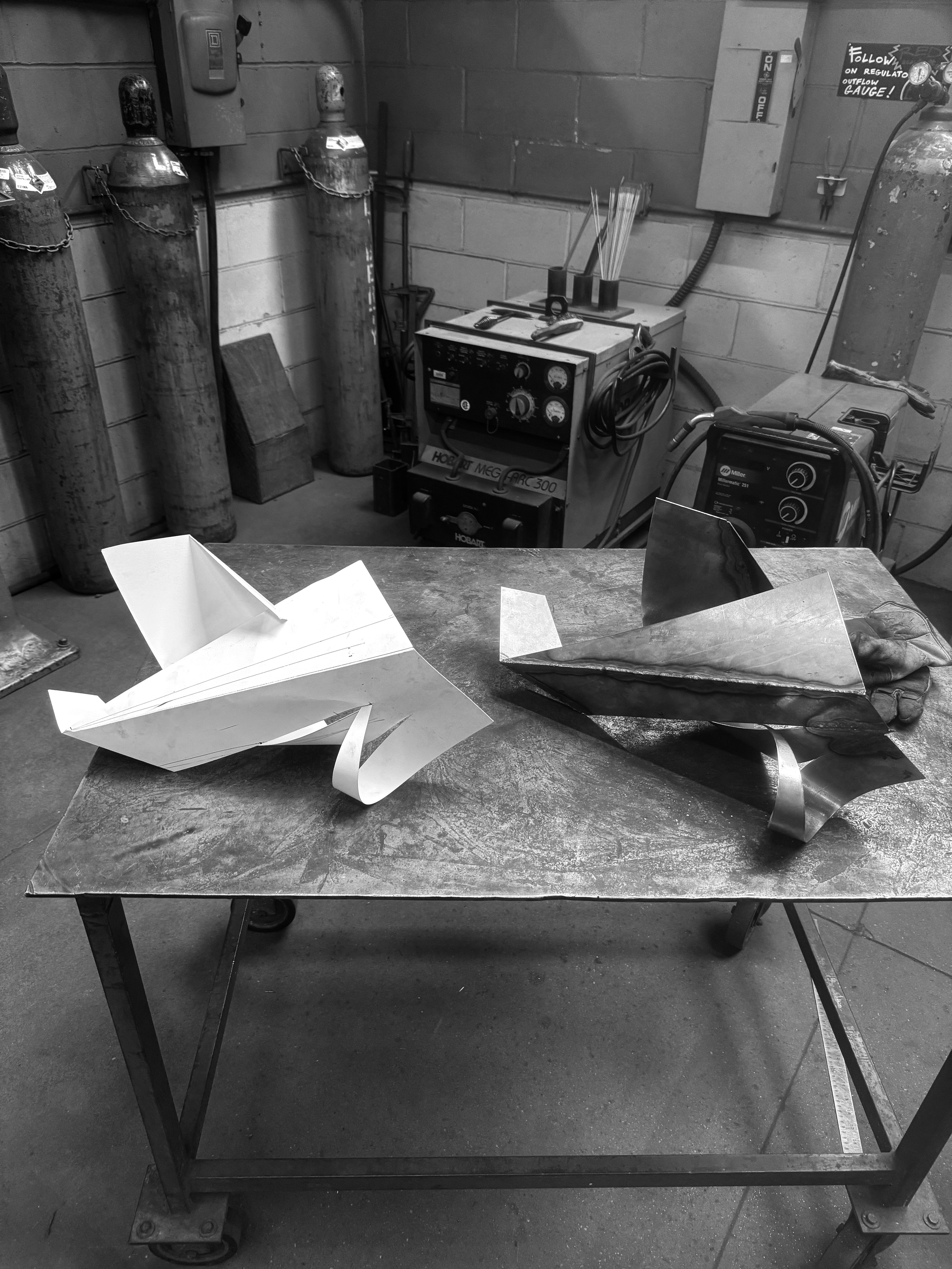 The planar study explores how gestural volume can be created through a flat sheet of paper using only 2 cuts and 3 scores. The final was executed in polished steel.