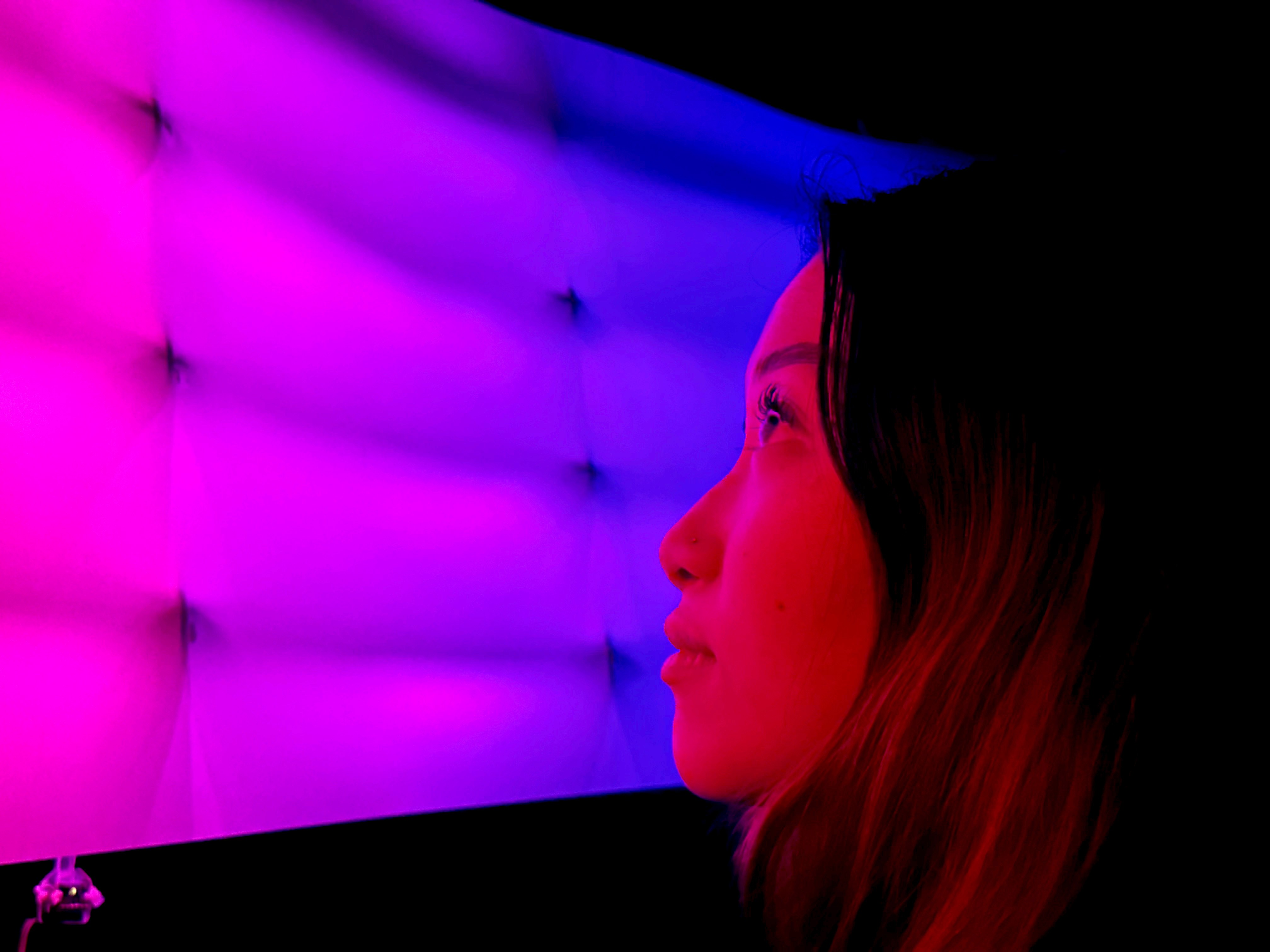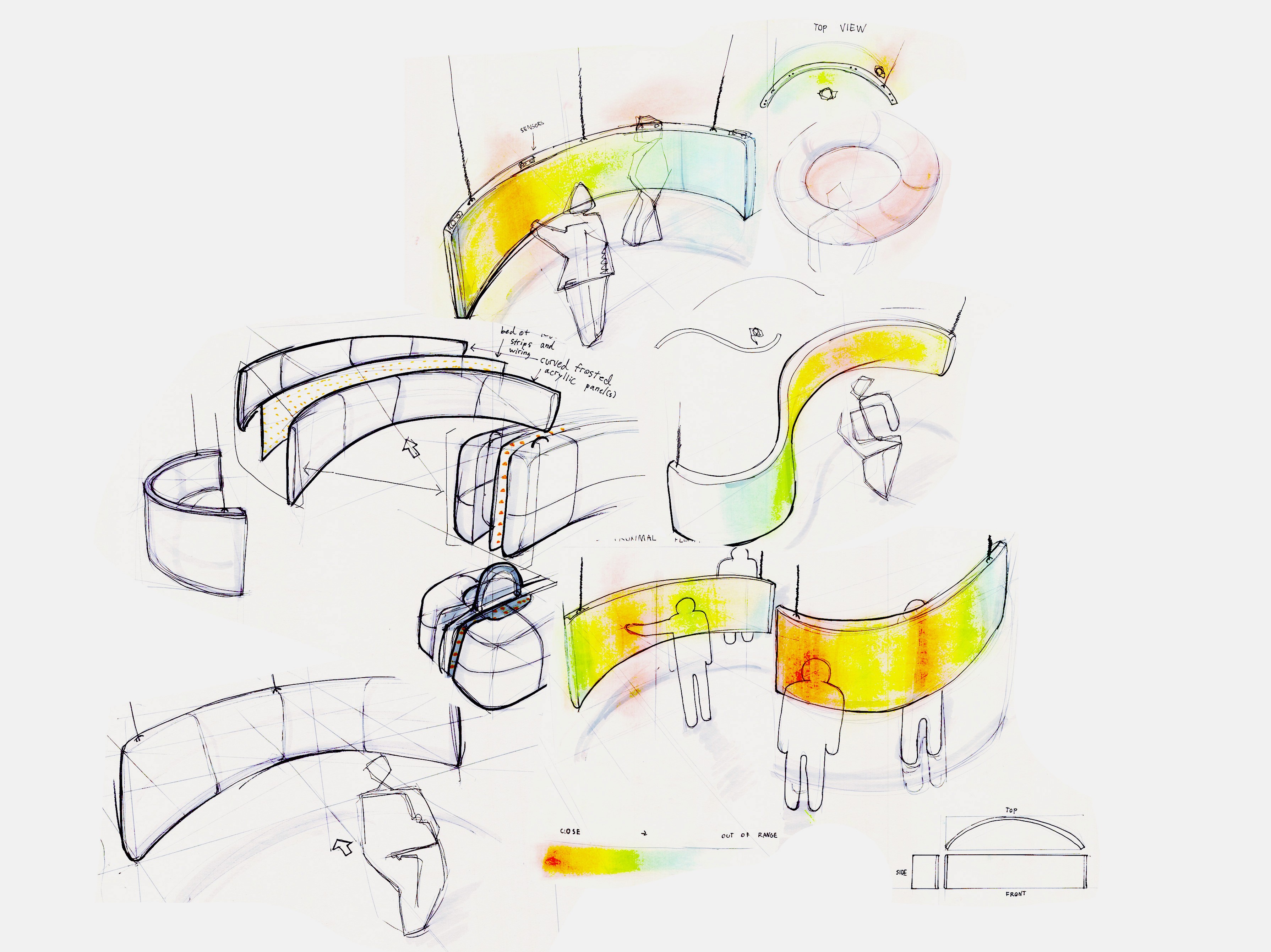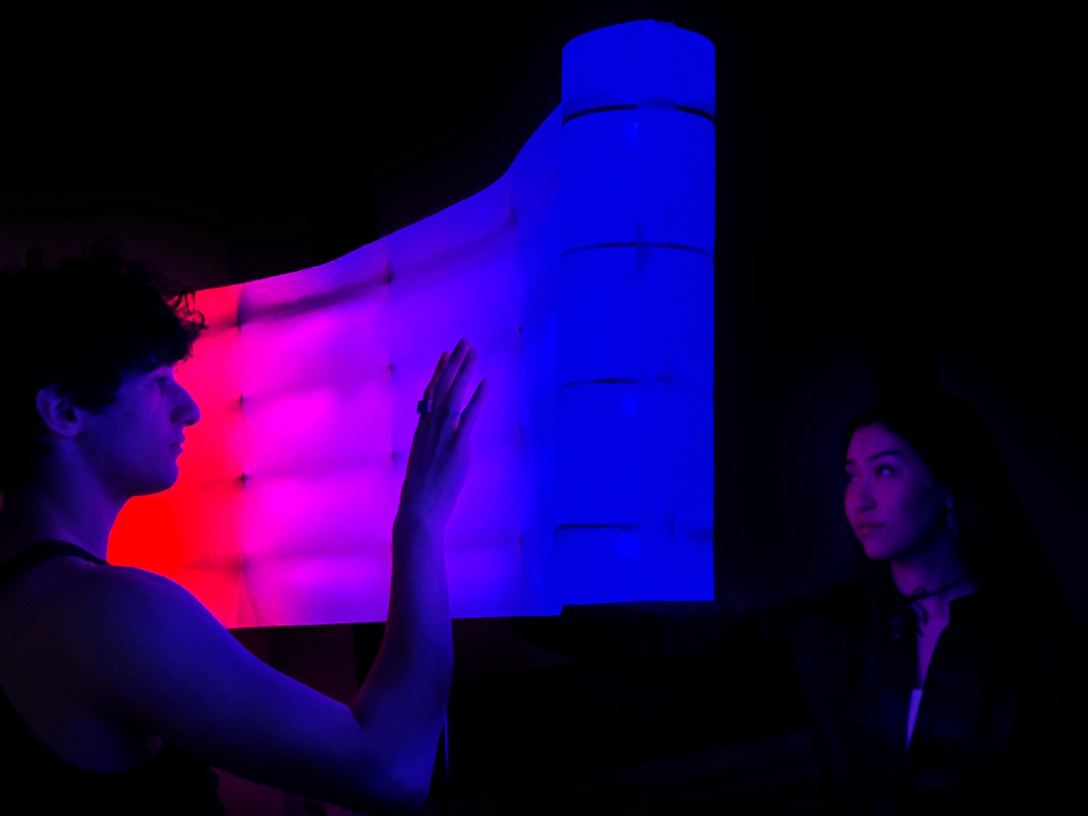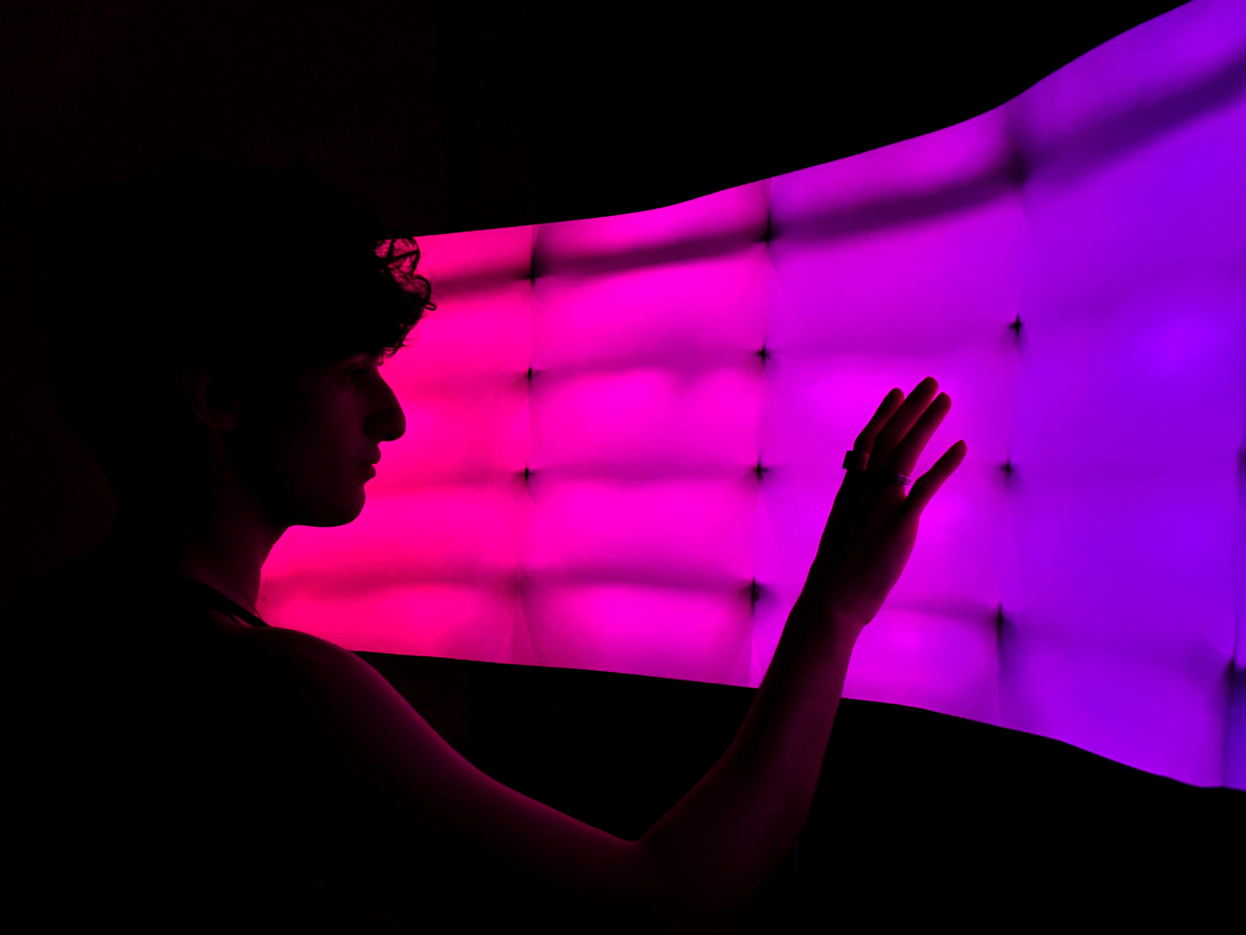 Direct Message is a proximal lighting installation, which changes color as the viewer gets closer and further to it. It uses IR sensors to measure distance, mapping those values along a spectrum of color shown through a floating plane of light.